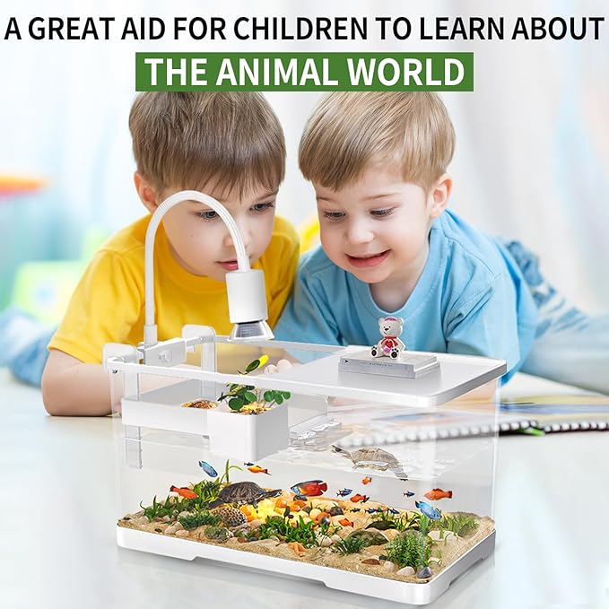 (Tank + Light + Filter + Filter Balls) Turtle Tank Kit, Turtle Tank Starter Kit,Bottom Drainage, Multi-Function Areas for Turtles, Crabs,Fishes, Amphibians,Reptiles. (15.75 x 8.64 x 8.64 Inch)